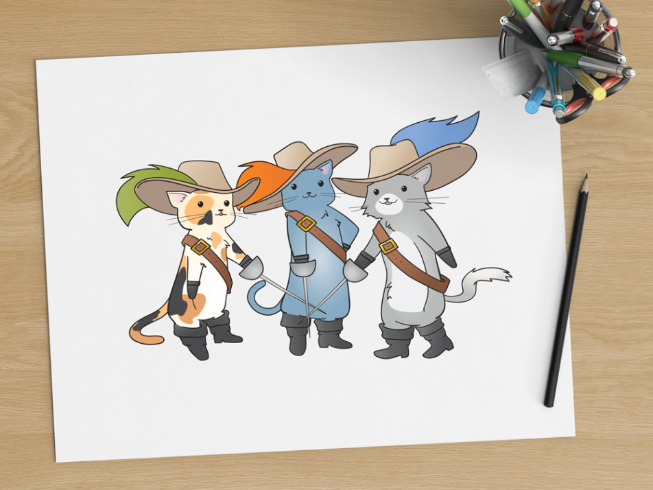 The 3 Meowsketeers Illustration created for Furry Friends Annual Charity Auction. To be used on all promo materials. Each year the auction has a theme. For 2018 the theme is “Three Meowsketeers”.