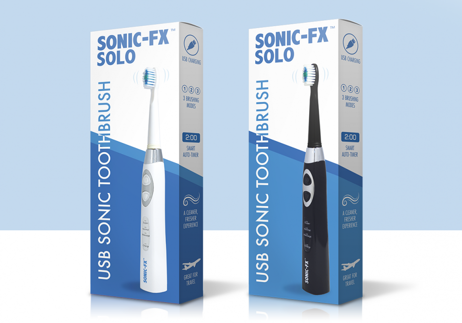 Sonic-FX USB Solo This toothbrush is a new product sold on Groupon. I designed the packaging and edited the photos under an extremely tight deadline. I kept the look simple and flat.